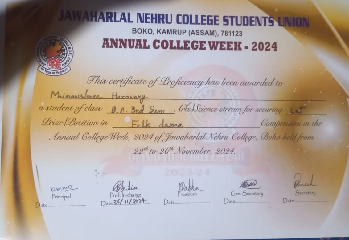 The department of Bodo was established in the year 1993. Since its inception the department has been trying to provide Higher Education in the regional language, Bodo. At the beginning the department provided Extension Service (H.S.) in 1993. Since the subject was newly introduced in the Gauhati University itself, there were no qualified lectures to teach in the Department of Bodo in Jawaharlal Nehru College, Boko as per UGC norms. Gauhati University introduced the PG Diploma in Bodo at that time. At the beginning, the department offered only Higher Secondary classes. Mr. Jibeswar Koch was the founder lecturer of the Department. He was appointed as a Tutor for one year. The second lecturer of the department was Mr. Dharma Kanta Boro (1995) who served for the next year. Later on, Mr. Binod Goyary (1995), Janoki Boro (1997), were appointed as contractual lecturers. But they did not continue their services. Miss Bhairabi Baro joined in 2002 as a non-sanctioned and later on regularised in 2012. Ansuma Kh. Bodosa was appointed as a contractual lecturer in 2004 and joined in permanent post in 2020. Mr. Jyotish Basumatary (2009) and Mrs. Jili Alchiary (2013) were appointed as contractual lecturers. Moreover, Dr. Tanu Mashahary joined in a permanent post on 1st June 2023. Presently, Miss Bhairabi Baro is the Head of the Department. The Department offers three years degree course in both Major and General as per the prescribe syllabus of the Gauhati University.