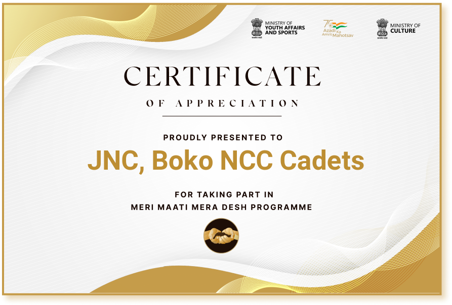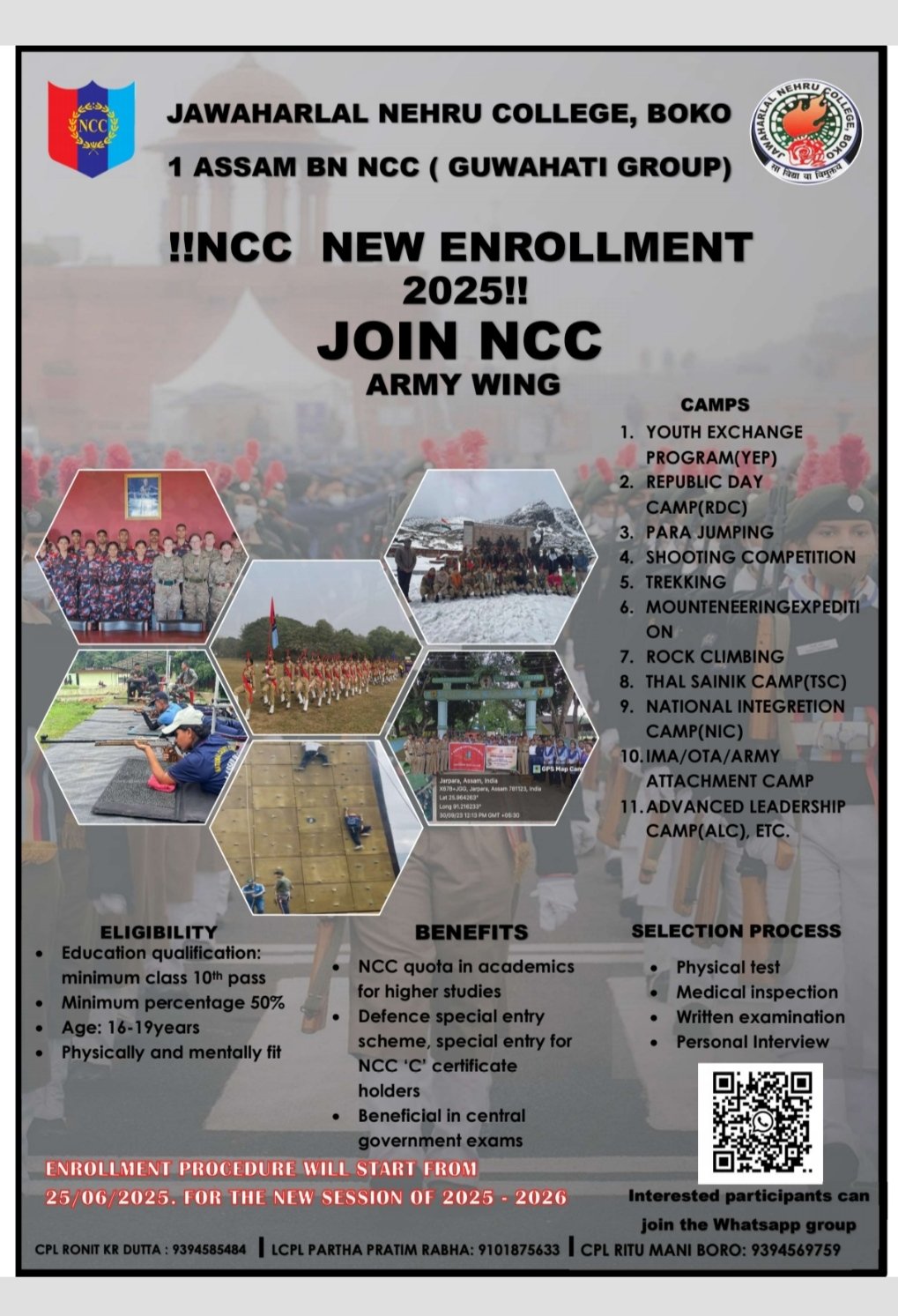 NCC Cell at Jawaharlal Nehru College, Boko was established in the year 2015 with the primary goal of providing cadets with an opportunity to develop leadership skills, discipline, and a sense of national service. This cell started with an enrollment of 18 cadets. And each year a total number of 18 cadets gets opportunity to enroll inclusive of SD and SW ( Senior Division (boys) : 10 & Senior Wing(girls) : 8 respectively. The demand of enrollment stands high as each year around 200 students try their luck to get enrolled. It’s a three year course where cadets receive B certificate and C certificate after completion. As the college is located in rural Kamrup, NCC Plays a pivotal role as an exposure into the military training. This NCC unit aims to offer its students a holistic education that combines academic excellence with practical, real-world experiences. In the 2nd and 3rd year the cadets will get opportunity to attend various training activities, camps and participate in competition that complement their academic learning. The college primarily offers training under the Army Wing of the NCC. While the focus is on military drills, leadership training, and physical fitness, cadets also engage in various social welfare and community service activities. The NCC cadets at Jawaharlal Nehru College, Boko, have opportunities to participate in national and regional-level camps, as well as events like Republic Day and Independence Day celebrations. IN-CHARGE OF NCC CELL Mr.BN Kuizebe appointed as CTO from 2015 to 2018 Lt. Ruptalin Engtipi appointed as CTO from 2018 to 2024 and later commissioned as Associate NCC Officer (ANO) on 21st December 2024 and still continuing her duty. This cell is under 1Assam Battalion NCC (Army Wing), Guwahati Group Headquarter, Northeast Region (NER) ENROLLMENT: The total number of intake every year is 18. NCC HISTORY AND ORGANIZATION The NCC in India was formed with the National Cadet Corps Act of 1948. It was raised on 15 July 1948. The origin of NCC can be traced back to the ‘University Corps’, which was created under the Indian Defence Act 1917, with the objective to make up the shortage of the Army. The NCC is headed by the Director General (DG), an officer of three-star rank. The DG is assisted by two Additional Director Generals (A and B) of two-star rank (major-general, rear-admiral or air vice-marshal). Five Brigadier level officers and other civil officials also assist him. The Headquarters of NCC is located in Delhi VARIOUS CAMPS: Annual Training Camp (ATC) Combine Annual Training Camp (CATC) Ek Bharat Shreshtha Bharat ( EBSB) Advance Leadership Camp (ALC) Army Attachment Camp Hiking and Trekking Camps Thal Sainik Camps(TSC) Rock Climbing Training Camps(RCTC) Republic Day Camp (RDC) Youth Exchange Programme (YEP)