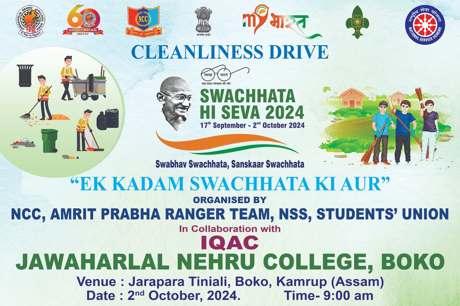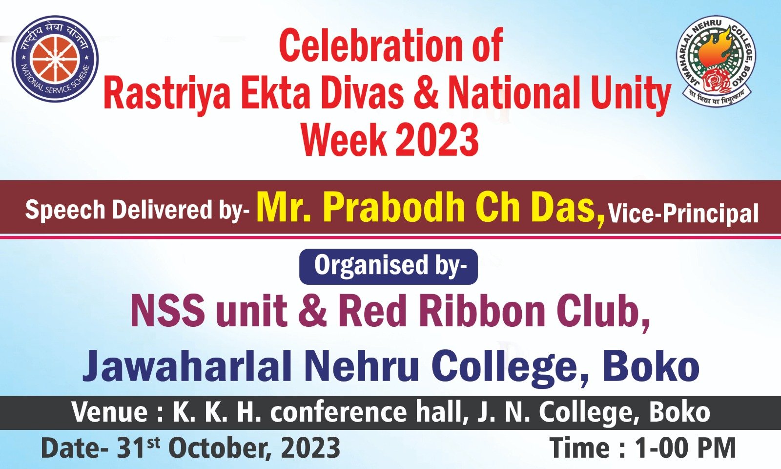 The NSS Unit of J.N. College, Boko, stands out as one of the college's most dynamic and engaged social service units. Operating under the auspices of Gauhati University, this unit has a rich history of providing diverse social services, all made possible through the commitment and enthusiasm of student volunteers. Since its establishment, the unit has actively engaged in various community service initiatives, extending its impact both within the college campus and in the surrounding adopted villages, police stations, and local communities. Students voluntarily join the NSS Unit, showing a commendable dedication to contributing to society while managing their academic responsibilities. The college appoints a well-trained Program Officer to oversee the activities the NSS undertakes, ensuring that volunteers are well-guided and supported in their endeavours. Each year, on the 24th of September, the NSS Day is celebrated, fostering a spirit of community and urging more students to participate in this noble initiative. Currently, the NSS Unit comprises 69 student volunteers, with 50 recruits welcomed in 2022, all of whom are eager to embark on a journey of social change. **BIRTH OF N.S.S** NSS was founded in September 1969 during the Gandhi Centenary year as part of a broader visionary approach included in the Fourth Five-Year Plan (1969-1974), emphasizing the importance of youth participation in national development. **AIM OF NSS** The primary aim of the NSS is to develop the personality of students through active community service, fostering a sense of responsibility and empathy as they contribute to the welfare of society. ** OBJECTIVES OF NSS ** 1. To Work with and Among People 2. To Engage in Creative and Constructive Social Action 3. To Enhance Knowledge of Self and Community 4. To Apply Scholarship to Practical Problems 5. To Develop Leadership Skills 6. To Acquire Skills for Self-Employment 7. To Bridge the Knowledge Gap 8. To Promote Service to Weaker Sections. **NATURE OF N.S.S.** The NSS is a prestigious social service initiative launched by the Ministry of Human Resource Development and the Ministry of Youth Affairs & Sports, Government of India, exclusively aimed at undergraduate students aspiring to enhance their social awareness and civic responsibilities.