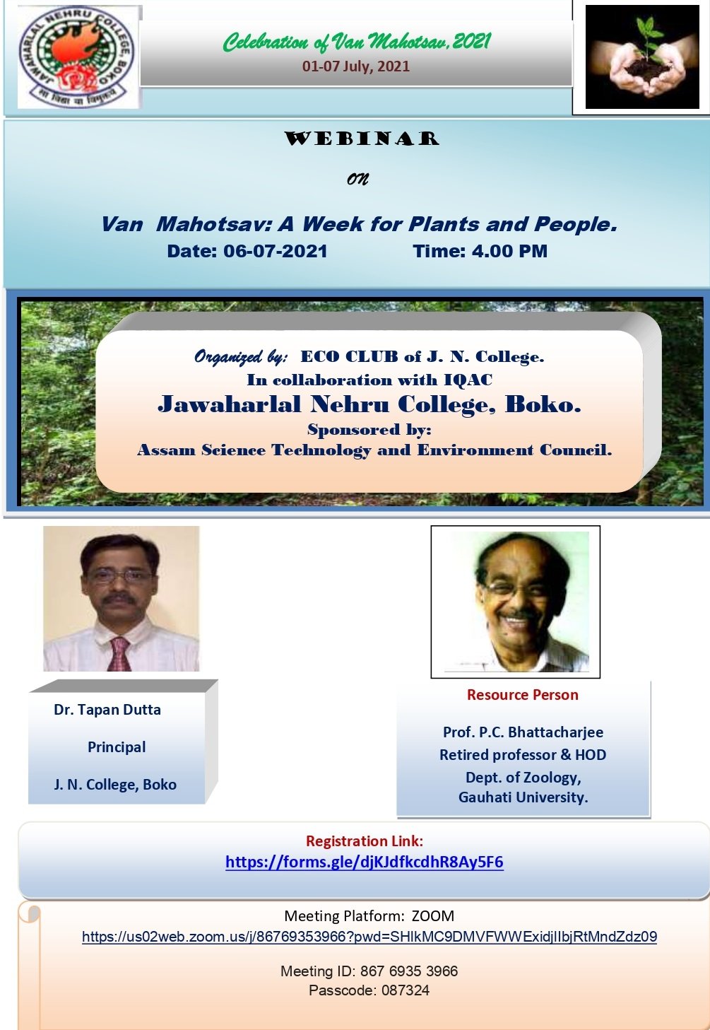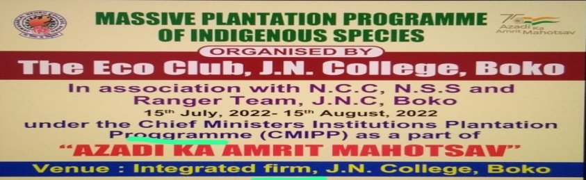 ECO CLUB _ J N College J.N.College , Boko in creating environmental awareness can be traced back to early years of new millennium. Observation of World Environment Day was a common practice . Gradually , small plantation programs were carried out. Faculty members of the science stream informally formed an Eco club . In the initial stages Eco club gave thrust on documentation of plant diversity within the college campus. There was no proper documentation of the activities of the Eco Club because all these programmes were carried out under the common banner of college. The turning point came in the year 2020 when the present principal of our college appointed two faculties as coordinators and joint coordinators of the official Eco Club of the college which was christened as The Eco club, J.N.C. It is now one of the recognized Eco Club by ASTEC( Assam Science , Technology and Environment Council ) under the Ministry of Environment , Forest and Climate Change , Government of India. At present, the primary thrust areas of the Eco club J.N.C are : • To create an eco-friendly environment in the college. • To complement and support government agenda related to environmental issues. • To generate an awakened and sensitive group of young minds that can feel for nature (environment ) and can devote in nurturing nature in their own ways. • To promote eco-friendly practices inside the college campus. • To create awareness among the local community about the need of conservation of bio-diversity. The Executive Committee of the Eco Club, J.N.C President : Dr. Tapan Dutta, Principal, J.N.College, Boko Coordinators : Dr. J.P.Sarma Baruah, Associate Professor : Dr. Rekha Chetry , Associate Professor Members : All Faculties : All office staff : All students